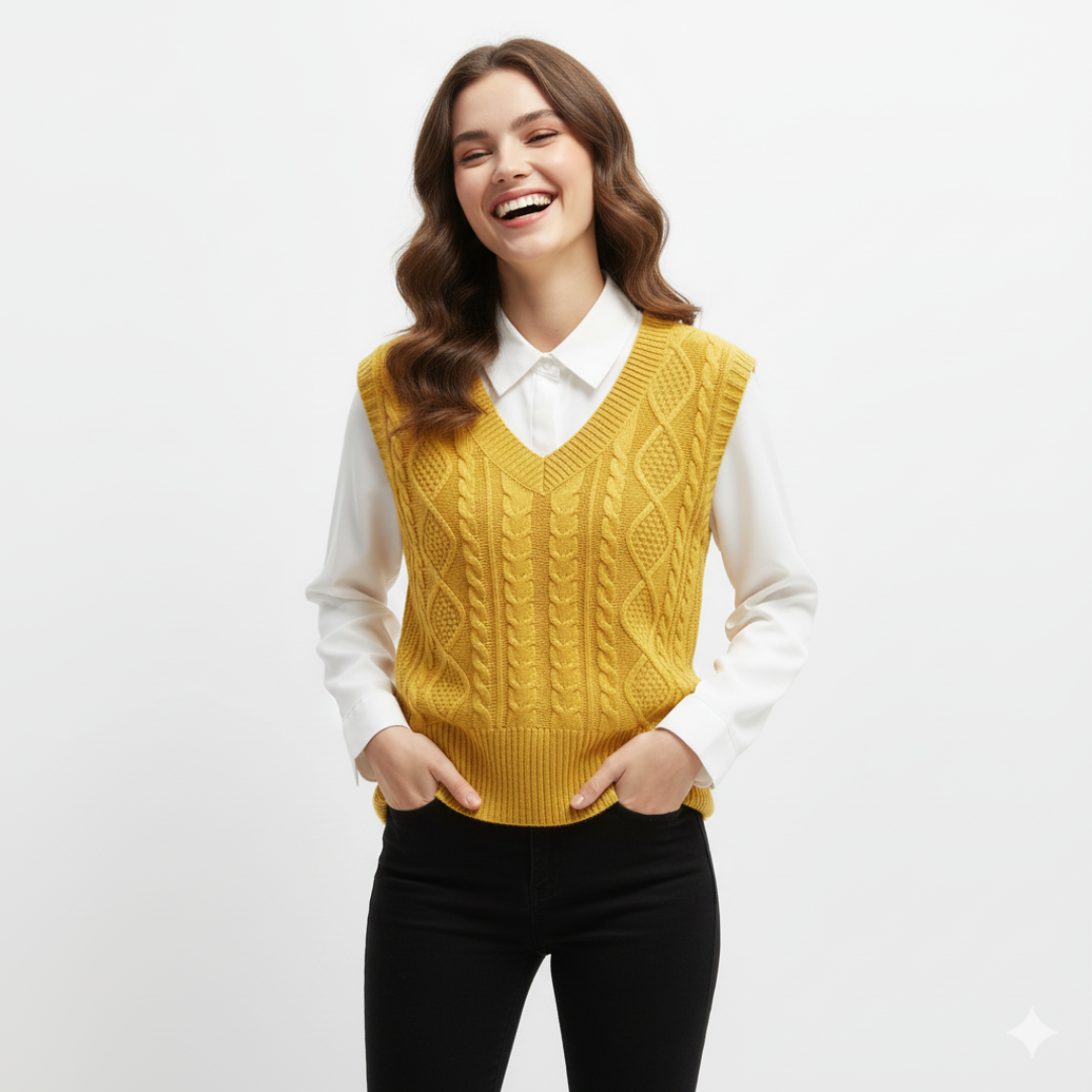 Diese Damenweste zeigt ein feines Zopfmuster und einen V-Ausschnitt. Das Modell eignet sich ideal zum Tragen über Blusen, Hemden oder Kleidern und ergänzt sowohl legere als auch gepflegte Outfits.