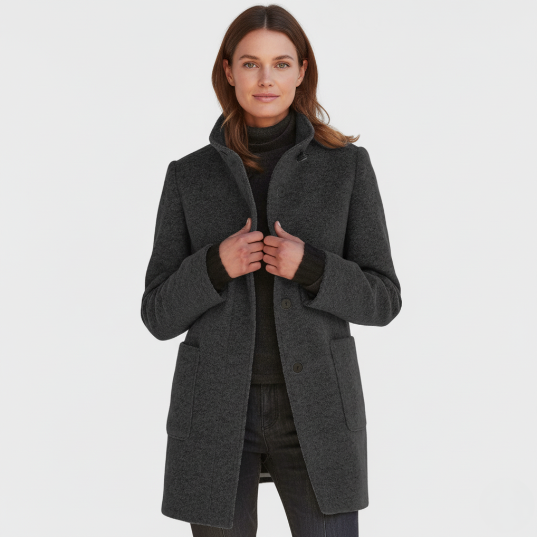 Dieser Damenmantel hat eine gerade Passform und ein gepflegtes Erscheinungsbild. Die Vorderseite ist mit einer Reihe von Knöpfen und aufgenähten Taschen versehen. Das Design macht den Mantel sowohl für den Alltag als auch für formelle Anlässe geeignet.
