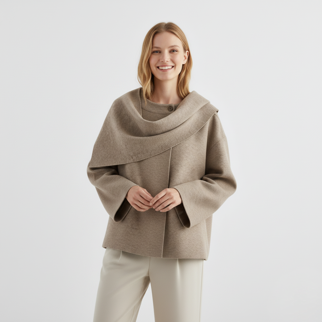 Mantel mit asymmetrischem Lagenlook und schalähnlichem Kragendesign.