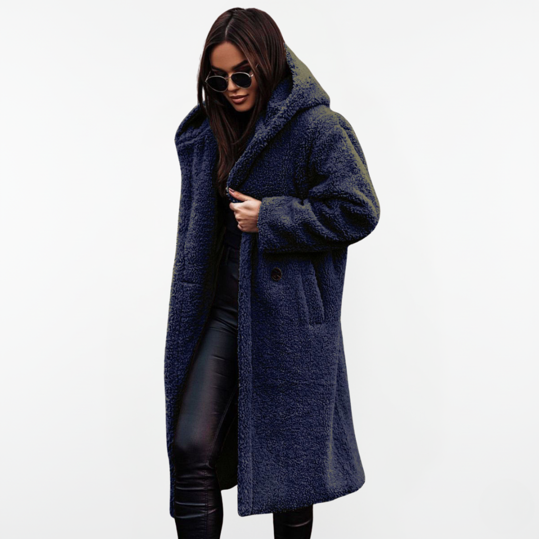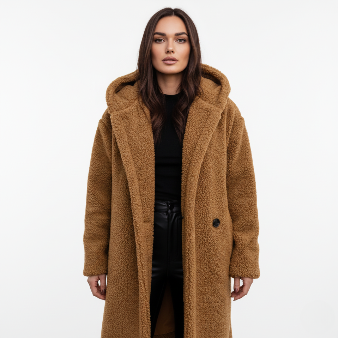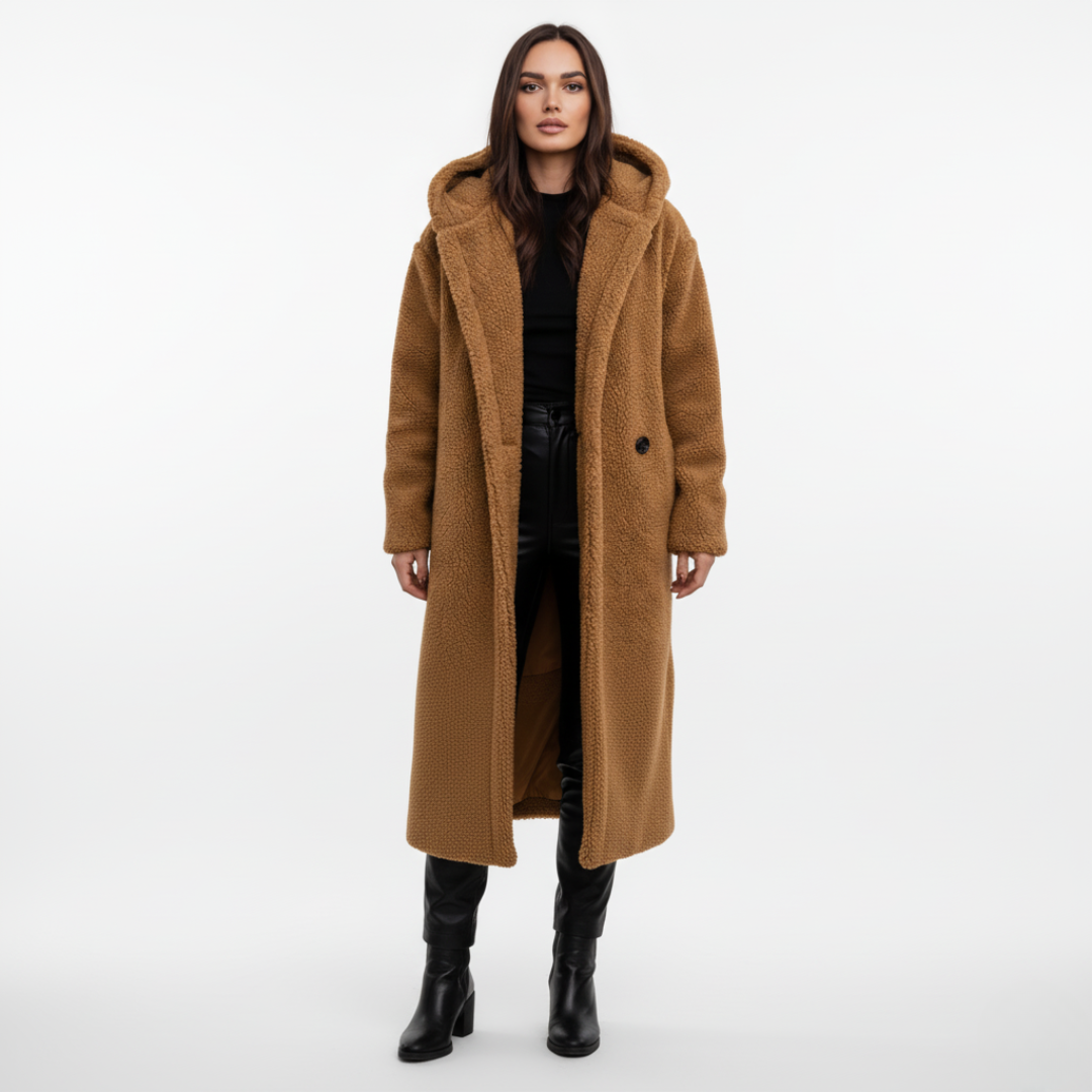 Moderner langer Teddy Mantel mit praktischer Kapuze